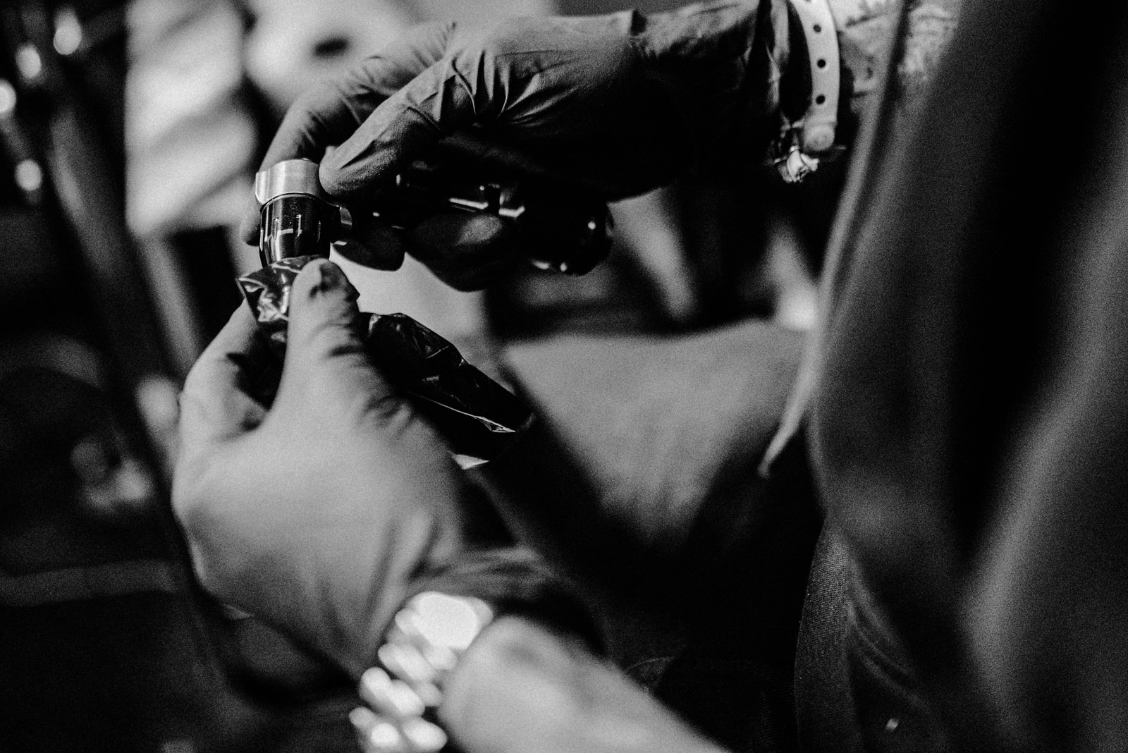 Wir achten bei der Auswahl der Materialien darauf, dass alles ohne tierische Bestandteile auskommt. Obwohl Farben und Nadeln zum Glück in den meisten Fällen vegan sind, gibt es ein paar Dinge bei welchen man genauer hinschauen muss. In Matrizenpapier oder in Teilen des Rasierers können zum Beispiel Gelatine verarbeitet worden sein. Wir achten auch darauf, dass alle Cremes und Pflegeprodukte Vegan sind. Außerdem wirst du bei uns keine Möbel aus echtem Leder finden und auch alles andere – vom Deo im Bad bis hin zu den Süßigkeiten ist Vegan.